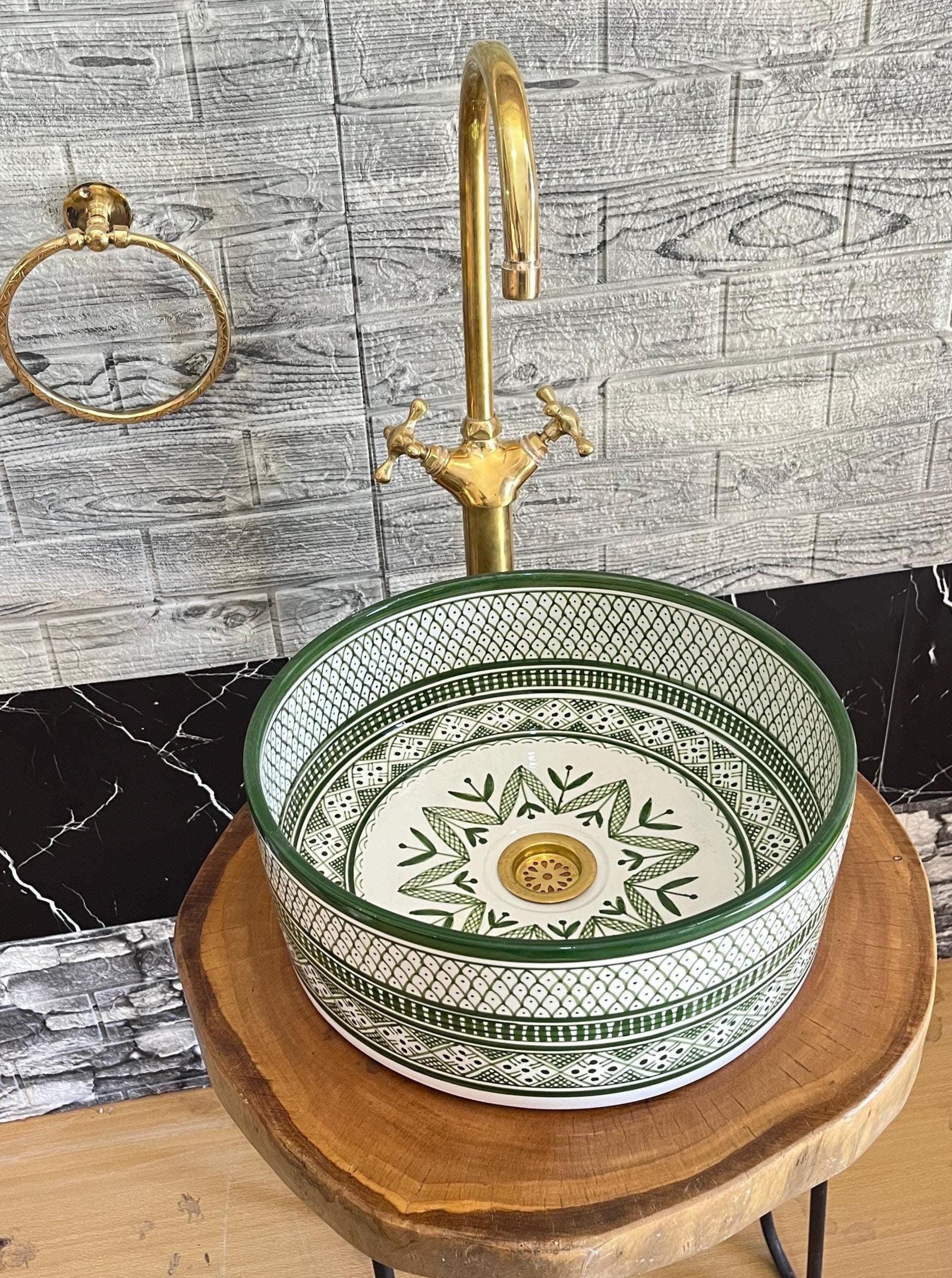 Hand-Painted Ceramic Sink: Green & White Moroccan Bathroom Basin